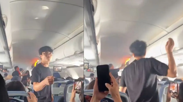 इसमें पैसेंजर और क्रू एक ओवरहेड कम्पार्टमेंट में दिख रही आग को बुझाने की कोशिश कर रहे हैं। जब आग बुझाई जा रही थी, तो पैसेंजर कोरियन भाषा में “जल्दी करो” चिल्लाते हुए सुना गया। एक तस्वीर में ऊपर रखे स्टोरेज कम्पार्टमेंट से तेज़ लपटें निकलती दिखीं। तस्वीर में दिख रहा था कि केबिन में काला धुआं था और यात्री आग बुझाने की कोशिश कर रहे थे।