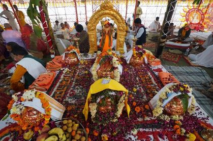 अयोध्या: उत्तर प्रदेश के अयोध्या में राममंदिर ध्वजारोहण समारोह के धार्मिक अनुष्ठान शनिवार को विधि विधान के साथ आरती के साथ सम्पन्न हुआ। कल के अनुष्ठान में प्रमुख रूप से राममंदिर के शिखर पर जिस ध्वज का आरोहण करना है उसका पूजन हुआ। राममंदिर ध्वजारोहण समारोह के मुख्य यजमान श्रीराम जन्मभूमि तीर्थ क्षेत्र के सदस्य डॉ अनिल मिश्र ने सपत्नीक अनुष्ठान किया और ध्वज का पूजन अर्चन हुआ। राममंदिर ध्वजारोहण समारोह में आमंत्रित अन्य यजमान ने भी सपत्नीक ध्वज पूजन में प्रतिभाग किया।