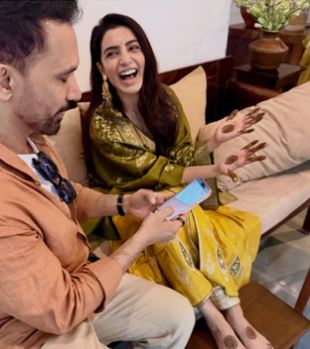 सामंथा और राज की नई तस्वीरें सोशल मीडिया पर वायरल हो रही हैं। सामंथा अपने मेहंदी वाले हाथ दिखाते हुए मुस्कुरा रही हैं और पीछे राज फोन में फोटो खींचते नजर आ रहे हैं। वरमाला के समय सामंथा, राज की आंखों में देखते हुए माला हाथ में पकड़े मुस्कुराती नजर आ रही हैं। वहीं, एक तस्वीर में सामंथा लाल साड़ी में कमरे से बाहर निकलते हुए बेहद सुंदर लग रही हैं। एक तस्वीर में मेघना और सामंथा साथ में सोफे पर बैठकर मेहंदी दिखाती नजर आ रही हैं।